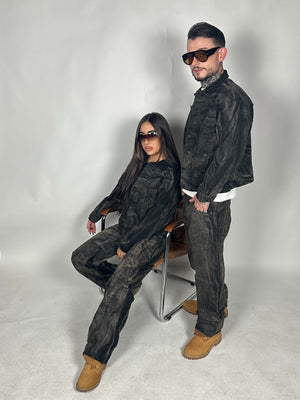 Il set, composto da giacca con tasconi e particolare sfrangiato e pantaloni oversize