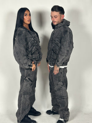 Look in denim composto da felpa con tasche e cappuccio e pantalone baggy con tasche.