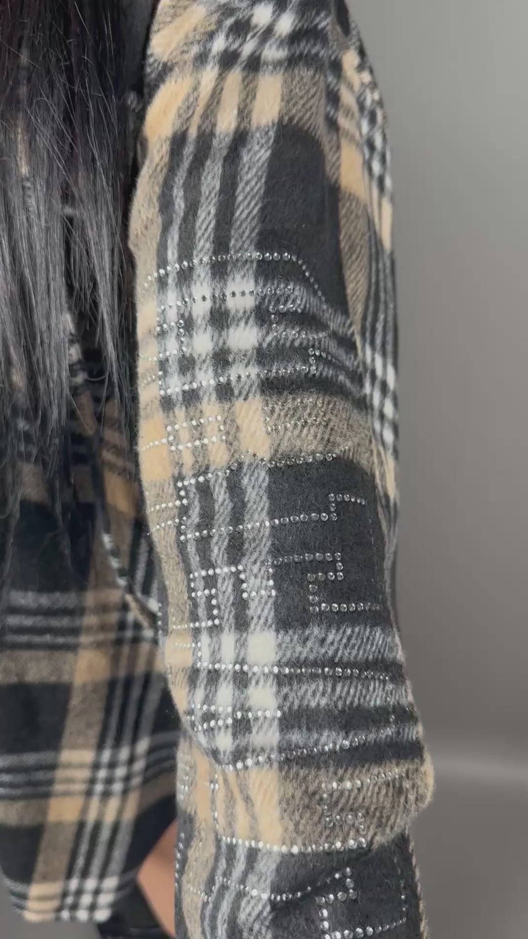 Camicia in flanella con cappuccio e applicazioni strass sulla manica.