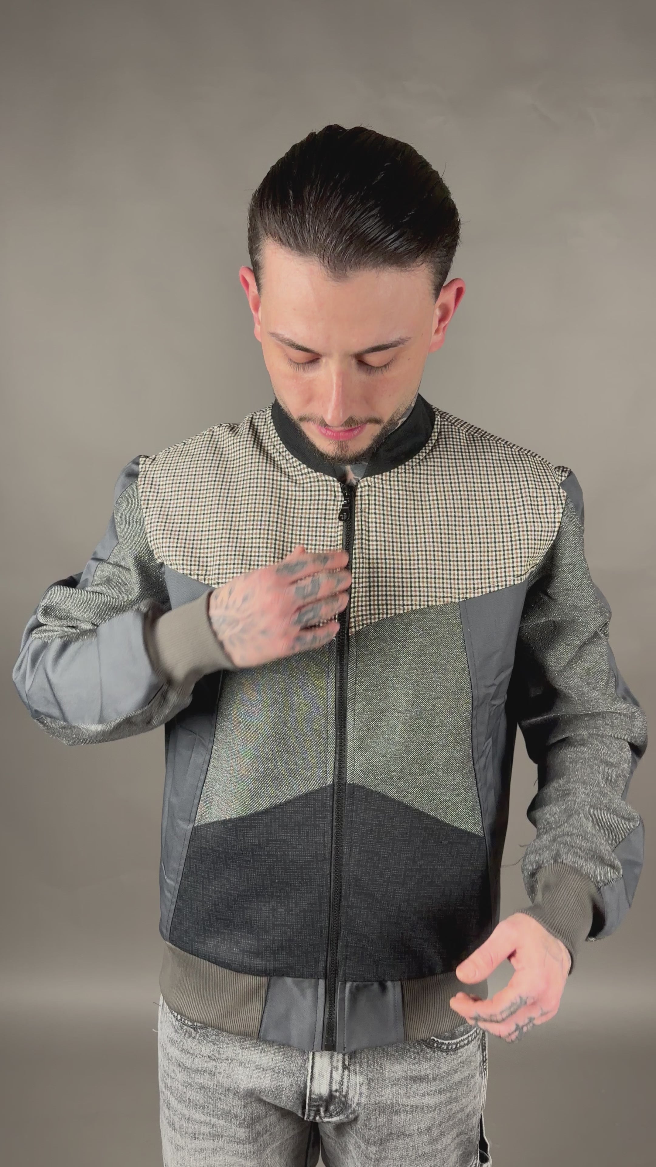 Giacca con interno trapuntato composta in diversi tessuti.
