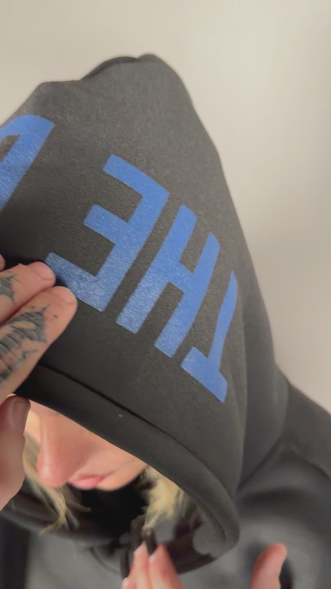 Felpa in tessuto felpato con marsupio e cappuccio grafica sul retro e sul cappuccio. Panta tuta con stringenti